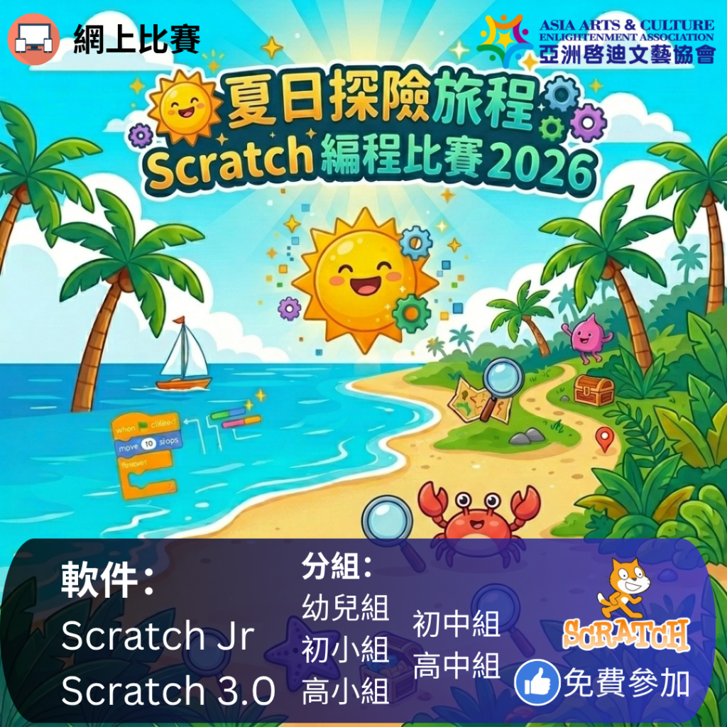Hey,未來的程式設計師們!歡迎參加《夏日探險旅程Scratch創意編程大賽2026》!透過動畫或遊戲項目「互動式的夏日探險活動」,展現您對探索、自然與冒險的創意想像。創作一個與家人或朋友一同享受夏日歡樂的專案,讓大家在陽光中體驗奇妙的數位旅程。